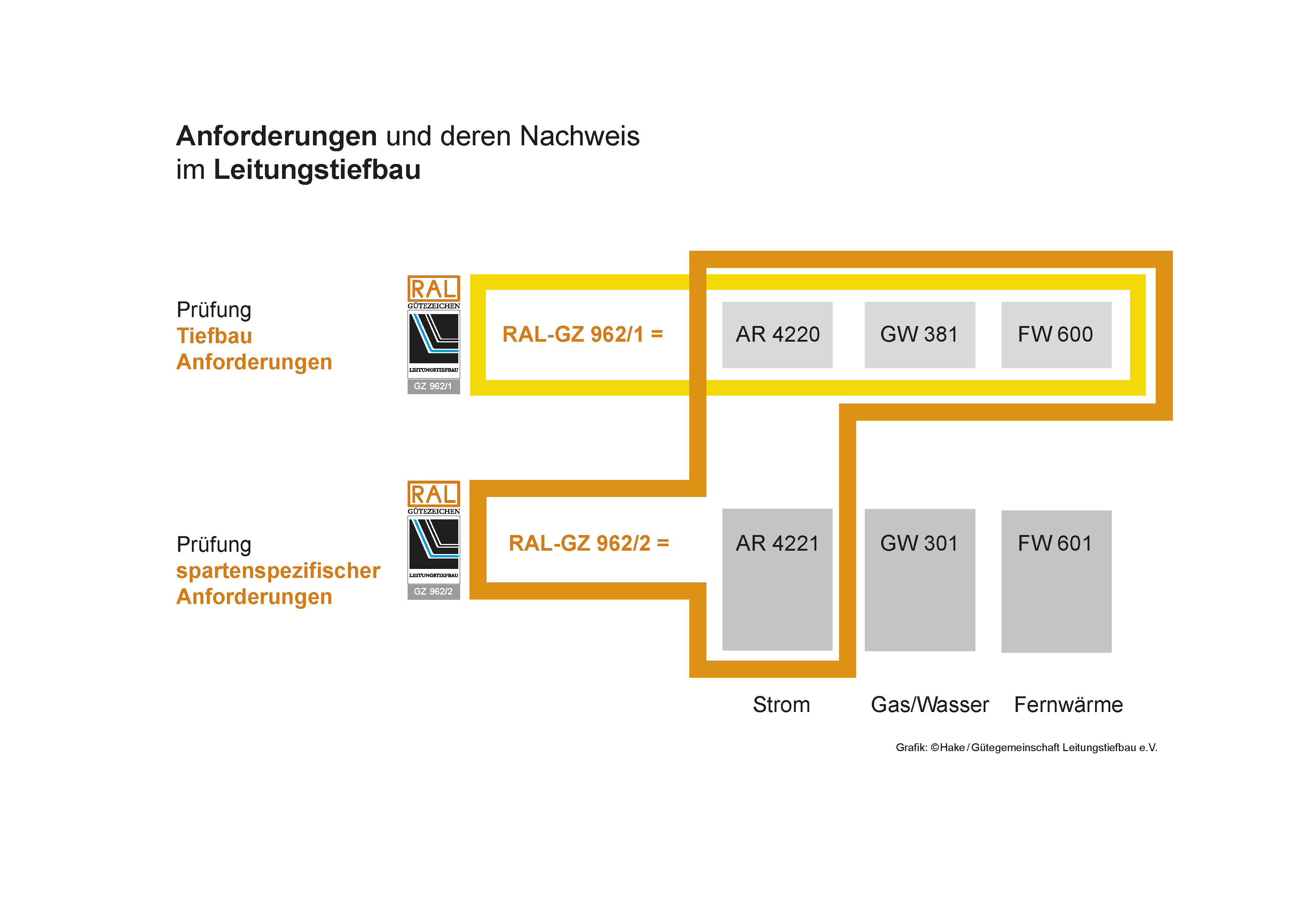 Die meisten Aspekte des Leitungstiefbaus vom Straßenaufbruch über die Grabenerstellung und -verfüllung bis zur Wiederherstellung der Straßenoberfläche und der begleitenden Verkehrssicherung, auch unter Berücksichtigung der einschlägigen Rechtsvorschriften, stimmen in den verschiedenen Sparten überein. Im RAL-GZ 962/1 sind formale, personelle und sachliche Anforderungen definiert. Bereits vorhandene technische Regeln bilden ebenfalls die Grundlage für die Prüfung. Diese Aspekte sowie optionale Kriterien an Bauunternehmen wurden von allen Beteiligten des Projektkreises für die Mindestanforderungen als grundlegend erkannt und übernommen.